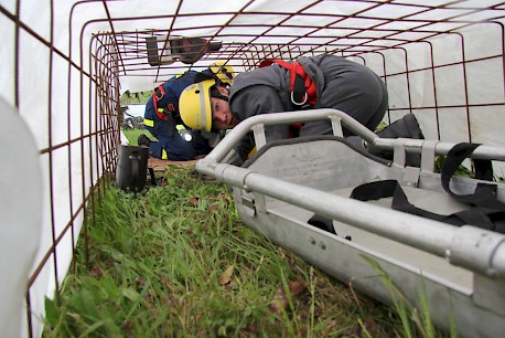 Zuerst mussten die Prüflinge in einer Theorieprüfung ihr Verständnis um den Aufbau des THW, die verwendeten Werkzeuge und wichtige Grundregeln für die Arbeit beim THW unter Beweis stellen. Danach ging es auf unseren Hof, auf dem die einzelnen Prüfungsstationen voerbereitet waren: Es mussten schwere Lasten angehoben, eine brennende Person gelöscht, eine Motorsäge und ein Bohrhammer in Betrieb genommen werden und vieles mehr. Zum Schluss stand noch eine Teamprüfung auf dem Plan, in welcher jeweils 3 angehende Helfer gemeinsam eine Person aus einem Tunnel retten mussten.