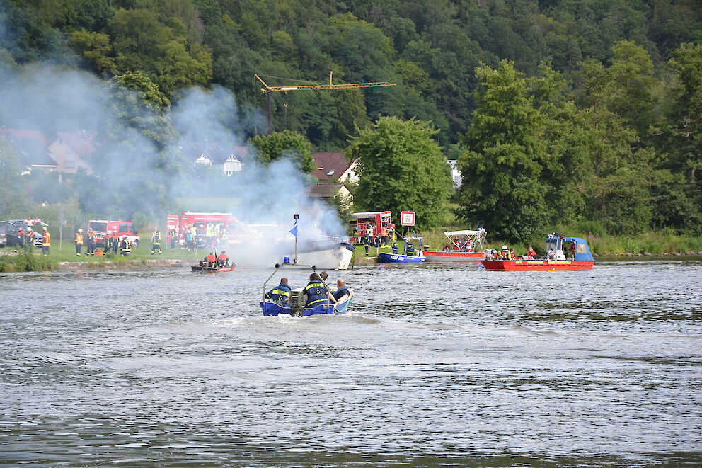 Unsere beiden Boote der Örtlichen Gefahrenabwehr sicherten gemeinsam mit der Wasserwacht und den Feuerwehren die Einsatzstelle wasserseitig ab. Das brennende Boot wurde ans Pflochsbacher Ufer gezogen und die Löscharbeiten fortgesetzt. Wir sicherten das Boot mit zwei Mehrzweckzügen, Stahlseilen und Ketten vom Ufer aus. Um sicherzustellen, dass eventuell auslaufende Kraft- oder Schmierstoffe nicht in den Main gelangen, setzte die Feuerwehr eine Ölsperre ein.