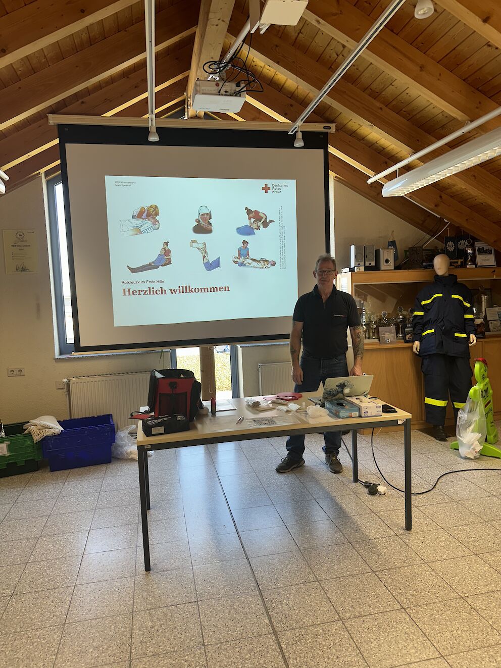Das Bedienen eines automatisierten externen Defibrillators, kurz AED, erklärte Ausbilder Andreas Stahl, ebenso wie die Herz-Lungen-Wiederbelebung und den Rautek-Rettungsgriff. Die Teilnehmenden hatten die Möglichkeit alle Situationen in der Praxis zu üben und Andreas hatte viele anschauliche Beispiele parat. Vielen Dank an das BRK und Andreas für die umfassende, kurzweilige und sehr wichtige Erste-Hilfe-Ausbildung.