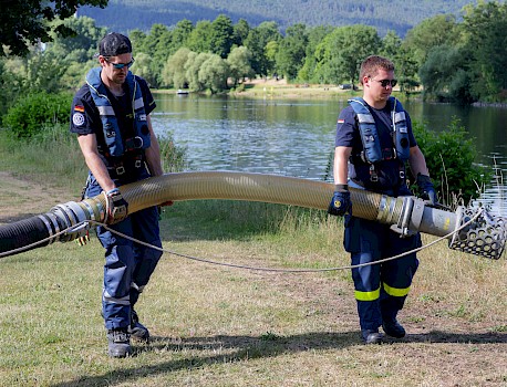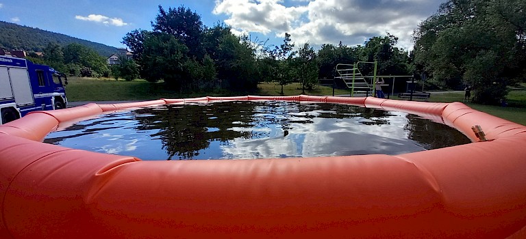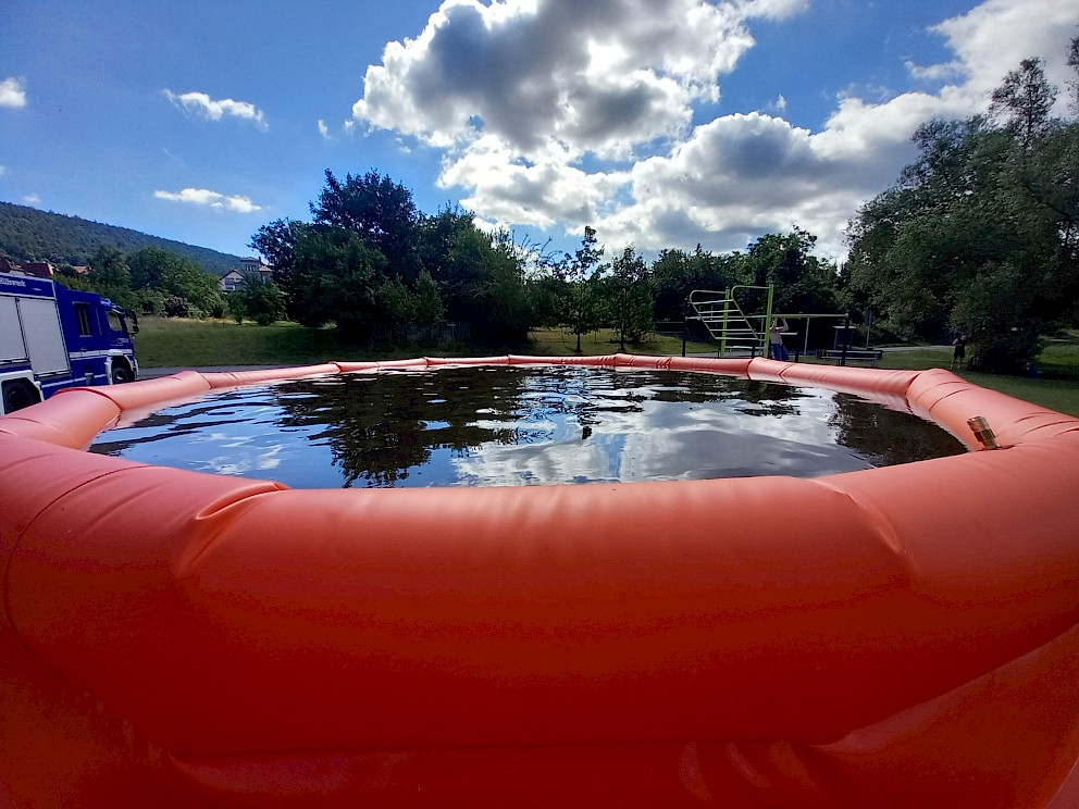 Nachdem die Fachgruppe Wasserschaden/Pumpen die Ausbildung im zweiten Quartal übernommen hatte, beendeten wir den Themenblock mit einer Ganztagesübung am Main. Aufgrund der Zunahme von Waldbränden in der gesamten Bundesrepublik übten wir den Aufbau und die Inbetriebnahme eines Pufferbeckens mit einem Fassungsvermögen von 24.000 Litern für Löschwasser, aus dem im Ernstfall die Feuerwehr Wasser entnehmen kann. Befüllt wurde dieses durch unsere Hochleistungspumpe „Hannibal“, die mit ihrer Förderleistung von 5.000 Litern pro Minute das Becken stetig mit Wasser versorgte. Von der Pumpe aus bauten wir eine kurze Schlauchstrecke mit sechs F-Schläuchen (90 m). Auch unsere Jugendgruppe war dabei, sodass die Jugendlichen live miterleben konnten, was die Erwachsenen machen.