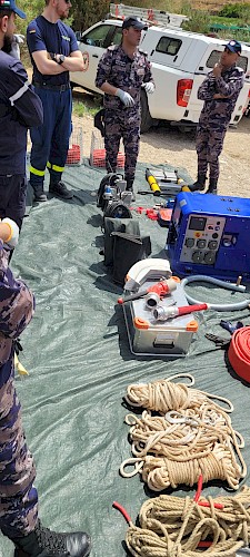 Ziel des Projektes ist es, die Kapazitäten des jordanischen Zivil- und Katastrophenschutzes durch ehrenamtliche Strukturen zu verstärken. Hierzu zählt auch die neu gegründete Pump Squad, bestehend aus Ausbildungs- und Ausstattungskonzept, welche die jordanischen Haupt- und Ehrenamtlichen auf Einsätze während und nach Starkregenereignissen vorbereitet. Neun ehren- und hauptamtliche THW-Experten waren hierfür im Einsatz. Ein Teil der Mannschaft kümmerte sich um den Ausbau der sechs schon gelieferten Pick-Ups und der drei gerade eingetroffenen Anhänger. Die mit Pumpausstattung voll beladenen Fahrzeuge stehen jetzt zur Übergabe an den jordanischen Projektpartner bereit. Die anderen THWler führten eine Ausbildung durch, die gleichzeitig auch das neue Gerät realitätsnah testete. Hierfür wurden zwei Gruppen gebildet, mit jeweils sechs Jordaniern, gemischt aus hauptamtlichen Zivilschützern und Ehrenamtlichen. Am Ufer eines kleinen Flusses übten die Teilnehmer die Grundfähigkeiten der neu gebildeten Einheit: Sichere Entnahme von Wasser, Pumpen über lange Wegstrecken und Überwinden von Hindernissen mit Schläuchen und Gerät. Auch anspruchsvolle Szenarien wie das Erkunden eines überfluteten Straßenzuges und das Auspumpen mehrerer Keller konnten dargestellt werden. Bei einer eindrücklichen Simulation einer Sturzflut galt es, die Bewohner eines Hauses zu retten und gleichzeitig die anströmenden Wassermassen abzuleiten. Zum Abschluss wurden noch Theoriekenntnisse spielerisch abgefragt. Außerdem traten die zwei Gruppen im Stil von „Spiel ohne Grenzen“ gegeneinander an und meisterten praktische Aufgaben. Hierbei gewann das Team von „Real Madrid“ knapp vor dem Team von „Bayern München". Michael Nätscher, OV Lohr, lobte das kameradschaftliche Verhältnis zwischen deutschen und jordanischen Einsatzkräften, aber auch unter den jordanischen Teilnehmern. Nach den nun erfolgreich durchgeführten Pump Squad Ausbildungen für das Haupt- und Ehrenamt an den Standorten Madaba und Zarqa, wird das nächste Training voraussichtlich 2025 stattfinden und einen weiteren Standort erschließen.